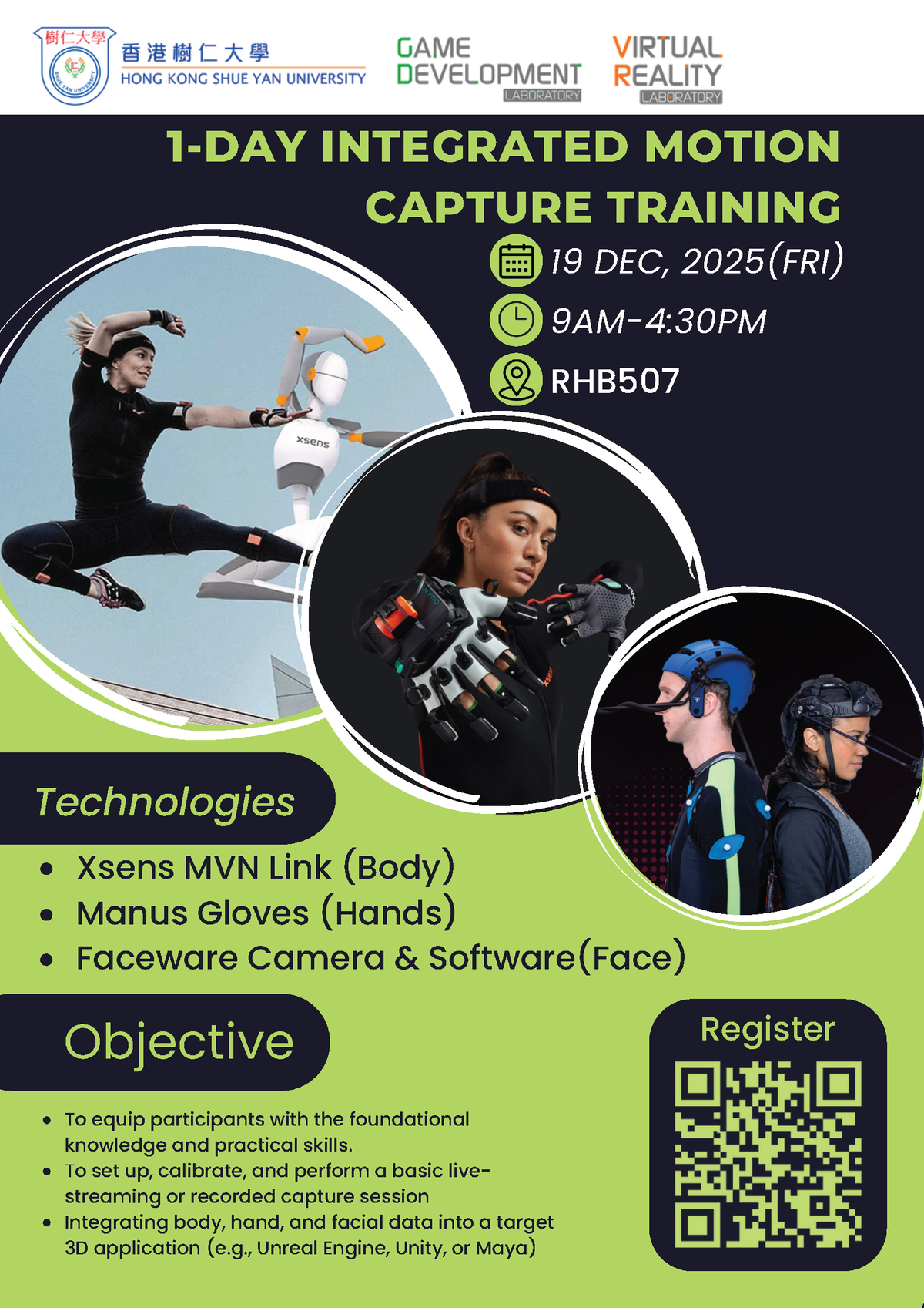 The Game Development Laboratory from the Department of Applied Data Science is delighted to invite you to our upcoming "One-Day Integrated Motion Capture Training Workshop".