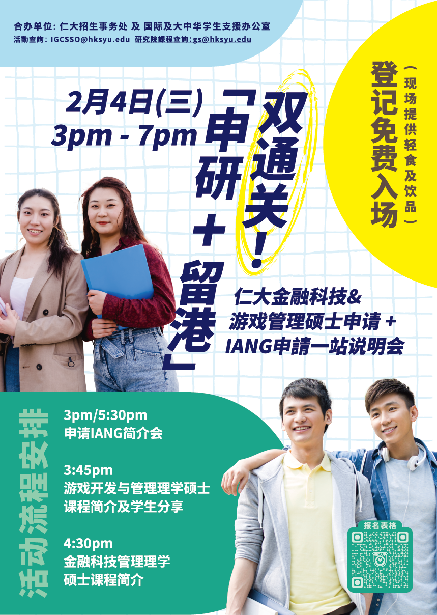 如果你正站在人生的重要轉捩點,誠邀你參加 2 月 4 日「申研+留港」一站式說明會,一次了解碩士課程選擇與 IANG 留港安排,為未來發展作好準備!