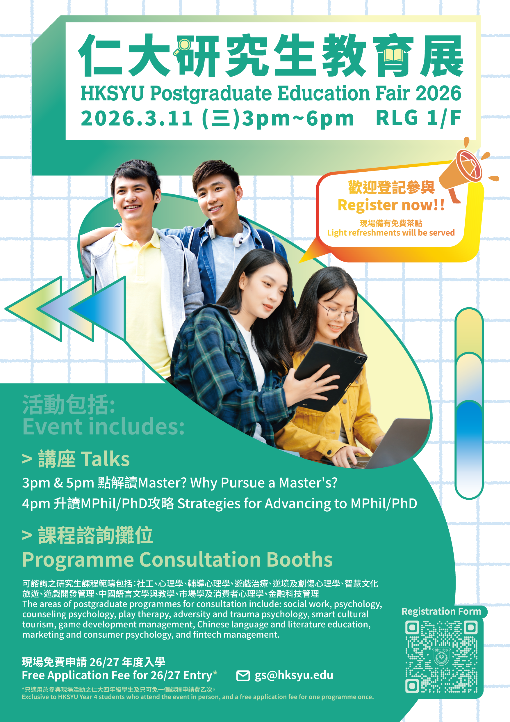 Welcome all HKSYU undergraduate and exchange students to join the “HKSYU PG Education Fair 2026”! Engage in talks and programme consultations about HKSYU master's studies in social work, psychology, counselling psychology, play therapy, trauma psychology, game development management, smart cultural tourism, FinTech management, Chinese language and literature and teaching, marketing with consumer psychology, and more. Enjoy a free application fee* for 2026/27 entry! Light refreshments will be available.