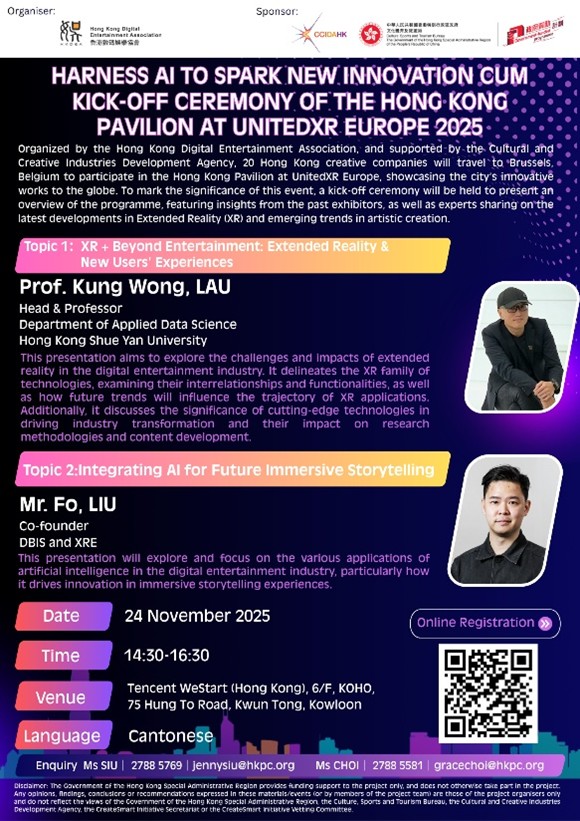 UnitedXR Europe 2025 – Hong Kong is organized by the Hong Kong Digital Entertainment Association (HKDEA), which spearheads a strategic initiative to establish a “Hong Kong Pavilion” at an international event in Brussels, Belgium. This project aims to showcase and promote Hong Kong’s creative industries through the integration of artificial intelligence (AI) and extended reality (XR) technologies. In addition to serving as a judge for the “UnitedXR Europe 2025 Project – Hong Kong,” the ADS faculty member delivered a seminar entitled “XR-Beyond Entertainment: Extended Reality and New User Experiences” during the kick-off ceremony on 24 November 2025. The seminar introduced innovative applications of XR technologies beyond entertainment, highlighting their transformative potential for user engagement and creative industry development.